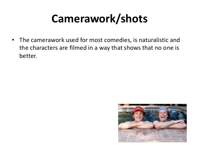 - 3. Camerawork/shots • The camerawork used for most comedies, is naturalistic and the characters are filmed in a way that shows that no one is better.