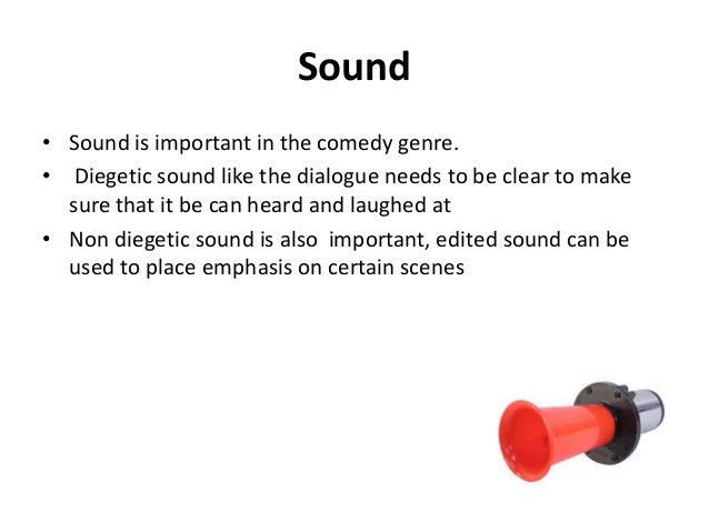 - 4. Sound • Sound is important in the comedy genre. • Diegetic sound like the dialogue needs to be clear to make sure that it be can heard and laughed at • Non diegetic sound is also important, edited sound can be used to place emphasis on certain scenes