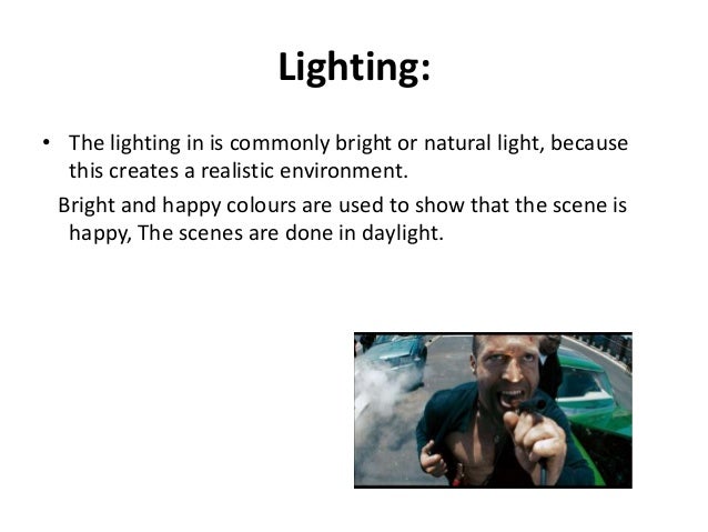 - 5. Lighting: • The lighting in is commonly bright or natural light, because this creates a realistic environment. Bright and happy colours are used to show that the scene is happy, The scenes are done in daylight.